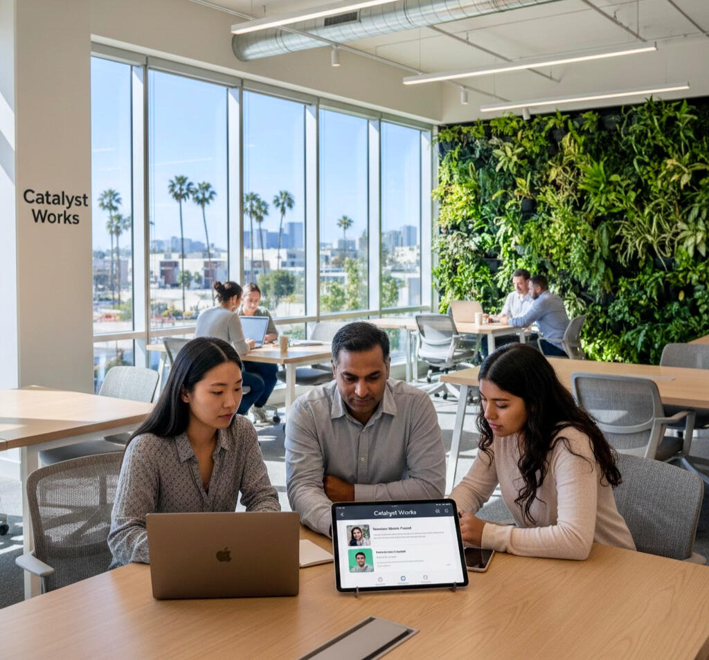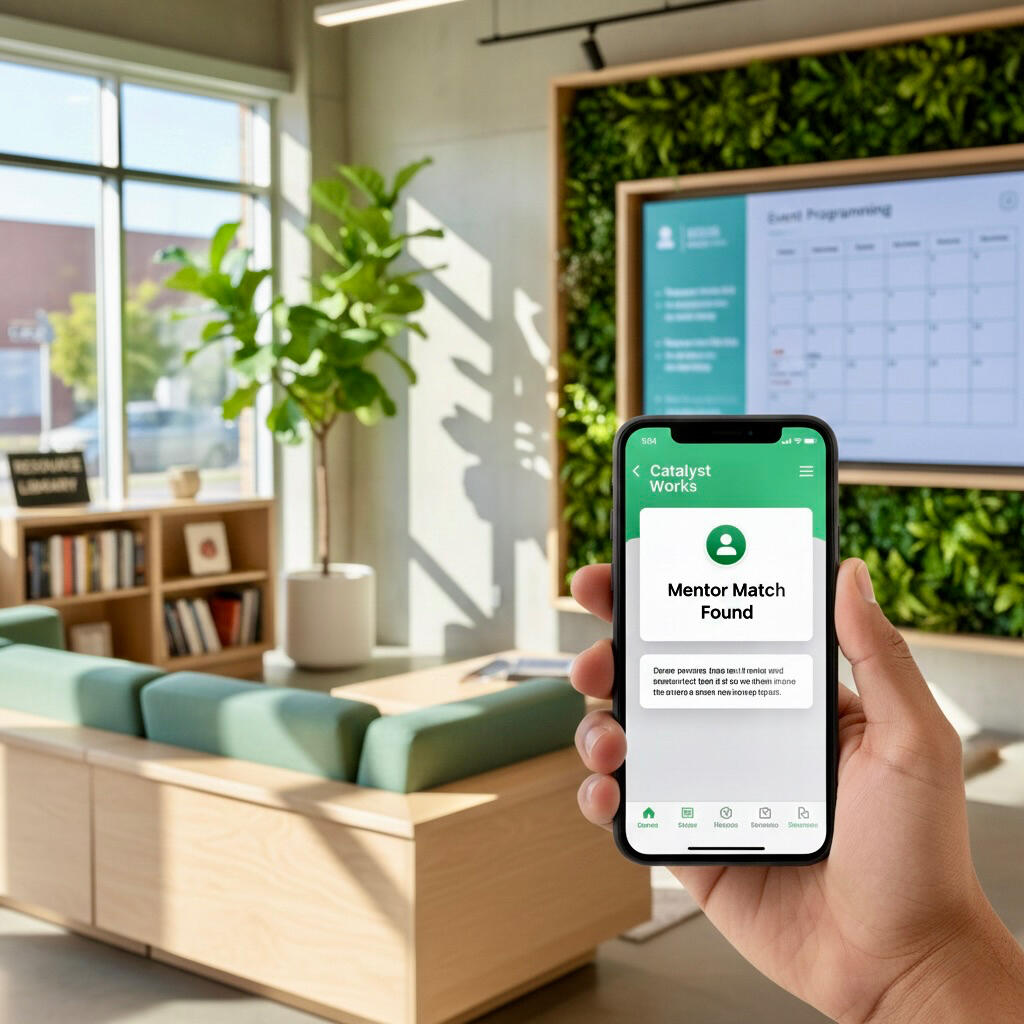 Catalyst Works starts with a powerful mobile app that drives connection and growth. Our platform provides smart check-ins, mentor matching, CRM integration, and progress tracking. Combined with our eco-conscious community space offering mentorship programming, event coordination, and a resource library, we create the only solution that integrates community, technology, and workforce development.